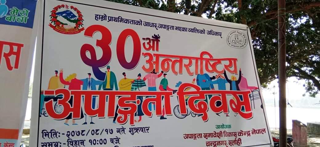 सर्लाही | चन्द्रनगरमा ३० औँ अन्तराष्ट्रिय दिवशको अवशरमा शुक्रवार कार्यक्रम गरिएको छ । अपाङ्गता समावेशी विकास केन्द्र नेपाल चन्द्रनगरको आयोजनामा ‘हाम्रो प्राथमिकताको आधार, अपाङगता भएका व्यक्तिको अधिकार’ भन्ने मुल नाराको साथ भव्य कार्यक्रम गर्दै दिवश मनाईएको हो ।