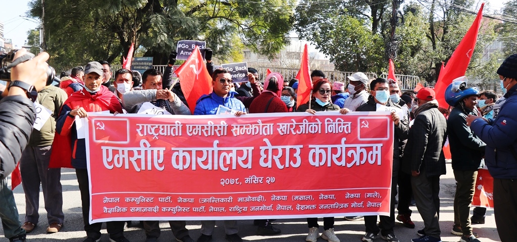 राजेश पाठक, काठमाडौँ | नेपाल कम्युनिस्ट पार्टी माओवादीको नेतृत्वमा आठ दलिय मोर्चाले एमसीएको कार्यालय घेराउ गरेको छ । संयुक्त राजनीतिक पार्टीको पूर्वघोषित सङ्घर्षको कार्यक्रमअनुसार दरबारमार्गस्थित एमसीएको कार्यालय घेराउ गरिरहेका हो ।