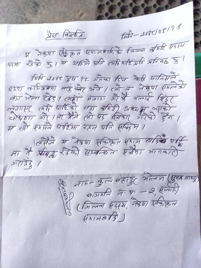 उहाँले आफु नेकपा एकीकृत समाजवादी सर्लाही जिल्ला कमिटी सदस्य भएको र सोहि पार्टीमा प्रतिवद्ध रहेको हुँदा भ्रममा नपर्न सम्वन्धित सवैमा जानकारी गराएको विज्ञप्तिमा उल्लेख गर्नुभएको छ ।