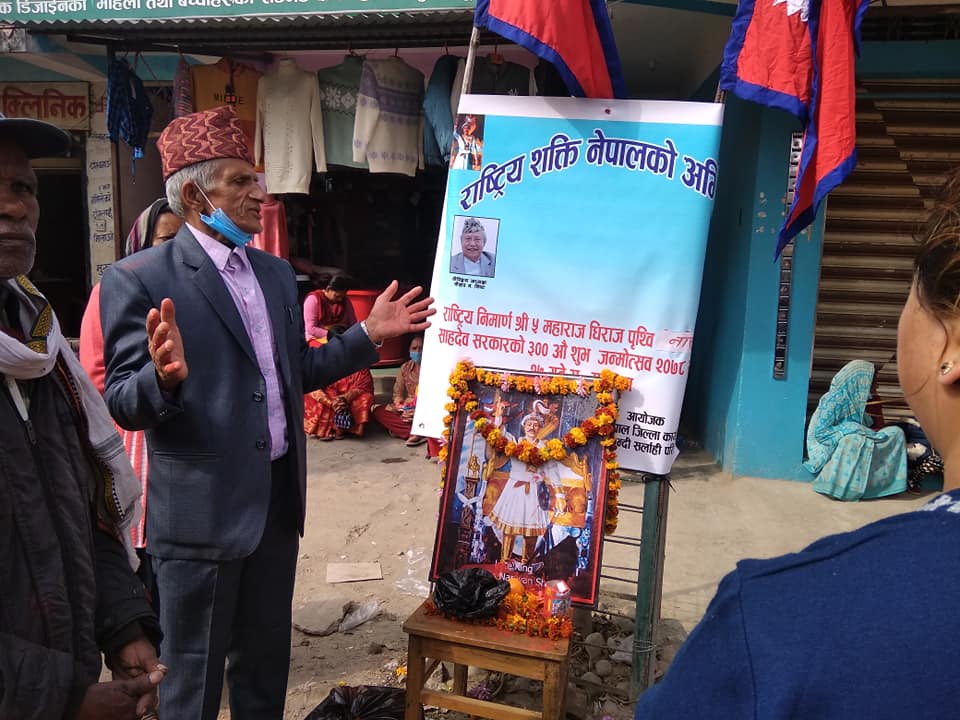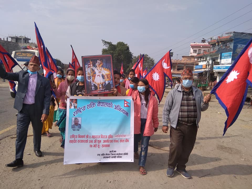 राष्ट्रिय शक्ति नेपालको जिल्ला संयोजक गोपाल प्रसाद ढकालको संयोजकत्वमा ¥याली सहित पृथ्वी नारायण शाहको फोटोमा माल्यार्पण गरिएको हो । बिभिन्न नारा सहितको ¥यालीले लालबन्दी बजार परिक्रमा गरेको अभियानकी सदस्य संगीता दाहालले जानकारी दिनुभयो ।