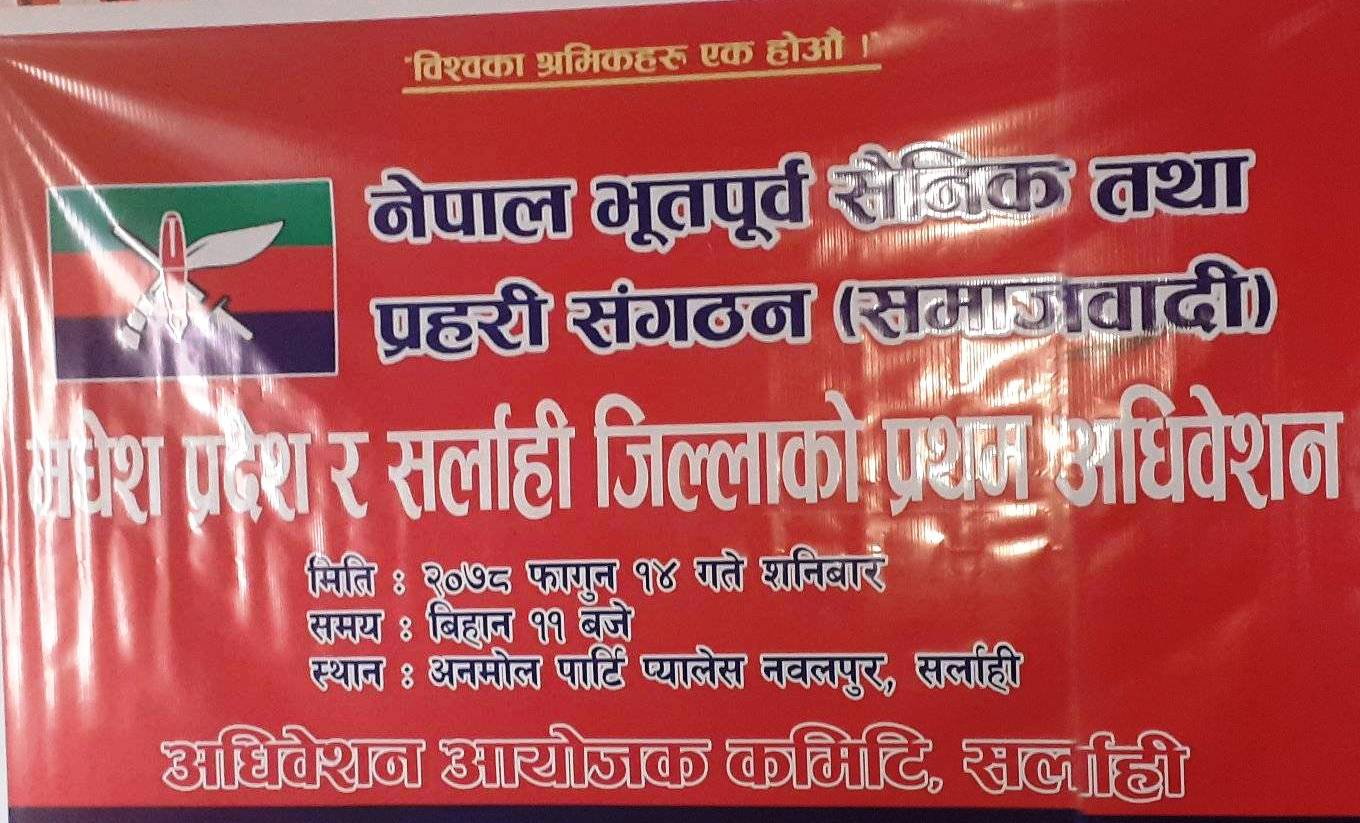 सर्लाही | माधव नेपाल नेतृत्वको नेकपा एकिकृत समाजवादी पार्टी निकट भुतपूर्व सैनिक तथा प्रहरी संगठनको मधेश प्रदेश तथा सर्लाही भेला सर्लाहीको लालबन्दीमा सम्पन्न भएको छ ।