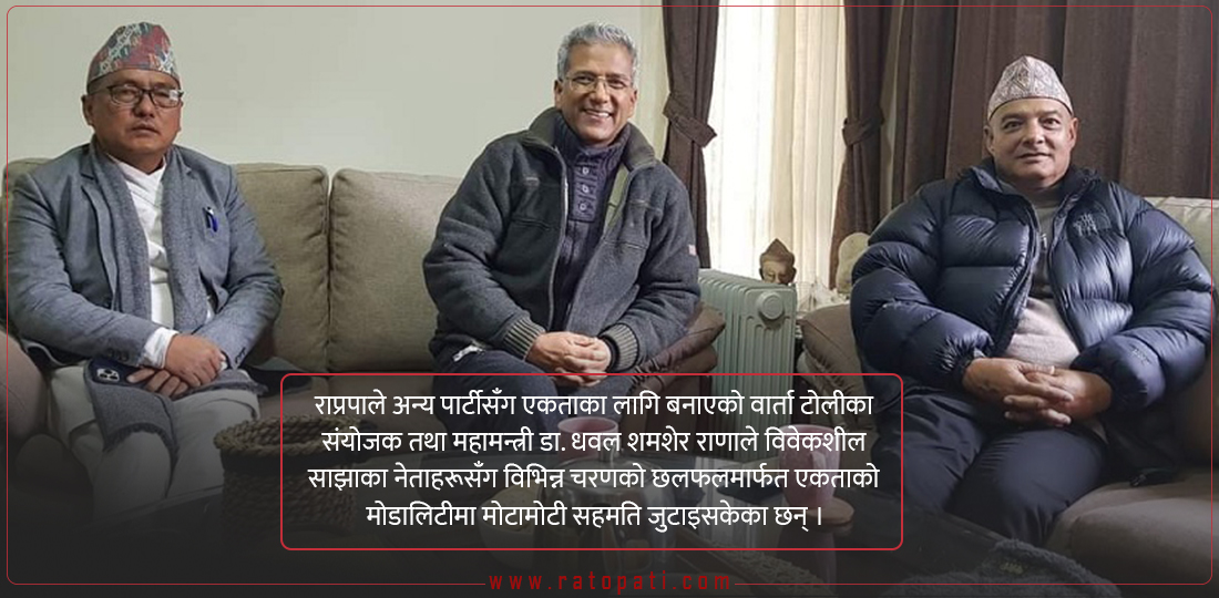राप्रपा उच्च स्रोतका अनुसार छिट्टै एकता घोषणा गर्ने गरी दुई पक्षीय छलफल अघि बढेको छ । जसअनुसार राप्रपाले अन्य पार्टीसँग एकताका लागि बनाएको वार्ता टोलीका संयोजक तथा महामन्त्री डा. धवल शमशेर राणाले विवेकशील साझाका नेताहरूसँग विभिन्न चरणको छलफलमार्फत एकताको मोडालिटीमा मोटामोटी सहमति जुटाइसकेका छन् । यस्तै अध्यक्ष राजेन्द्र लिङ्देन र विवेकशील साझाका अध्यक्ष रवीन्द्र मिश्रबीचसमेतको वार्ताले पनि एकतालाई मूर्तरूप दिएको नेताहरूको भनाइ छ ।