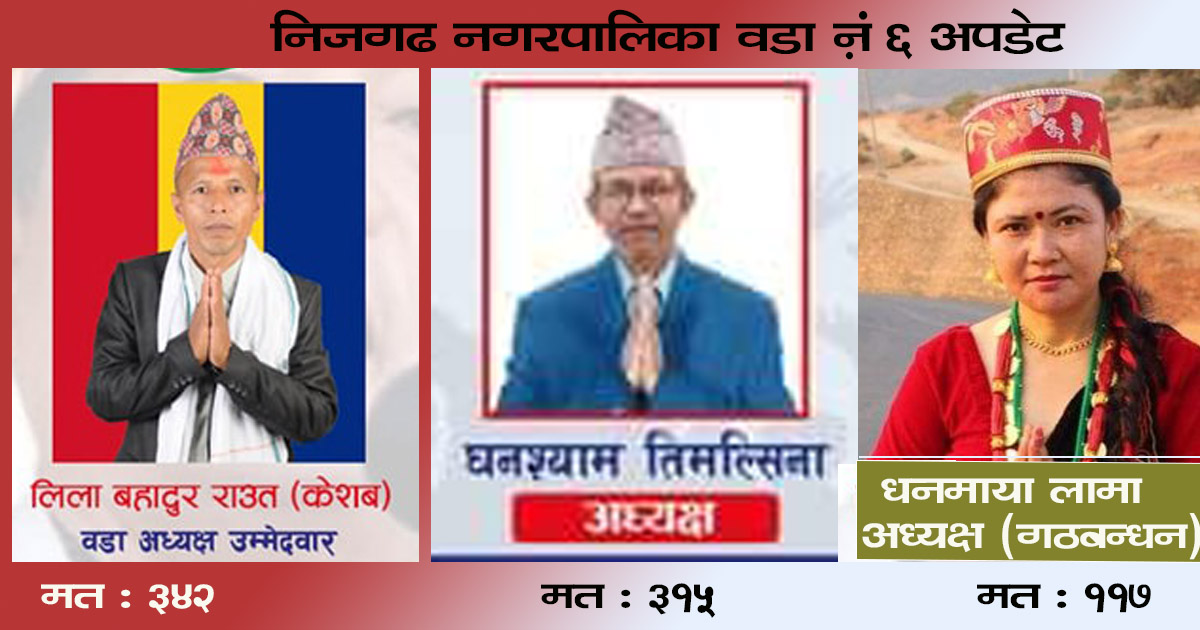 बारा । बाराको निजगढ वडा नं. ६ मा राप्रपाका उम्मेदवारको अग्रता पाएको छ । वडा अध्यक्षका उम्मेदवार लिलाबहादुर राउत ‘केशव’, ले एमालेका उम्मेदवार घनश्याम तिमल्सिनासंग २७ मतले अग्रता लिएका हुन् ।