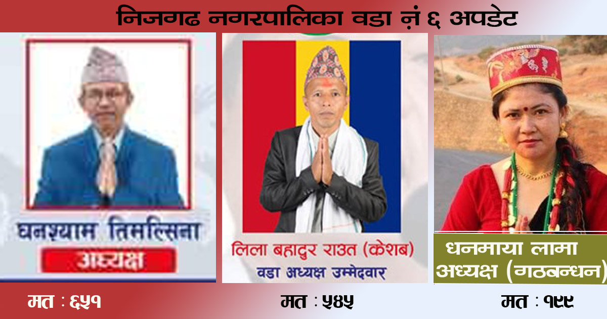 बारा । बाराको निजगढ वडा नं. ६ मा एमालेले अग्रता लिएको छ । वडा अध्यक्षका उम्मेदवार घनश्याम तिमल्सिनाले १०६ मतले अग्रता लिएका हुन् ।