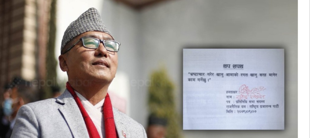 संसद् भवन नयाँ बानेश्वरमा बिहीवार सांसद पदको शपथ लिँदा उनले भ्रष्टाचारबारे पनि छुट्टै व्यहोरा समावेश गरे।
