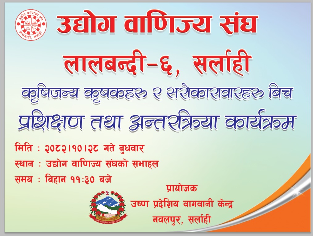 लालबन्दी, २८ माघ । लालबन्दीमा कृषक तथा सरोकारवाला निकायबिच प्रशिक्षण तथा अन्तर्रकृया कार्यक्रम सम्पन्न भएको छ । उद्योग वाणिज्य संघ लालबन्दी सर्लाहीले उष्ण प्रदेशिय बागवानि केन्द्र नवलपुरसँगको समन्वयमा कृषक र सरोकारवाला निकायबिच अन्तरकृया कार्यक्रम सम्पन्न गरेको हो ।