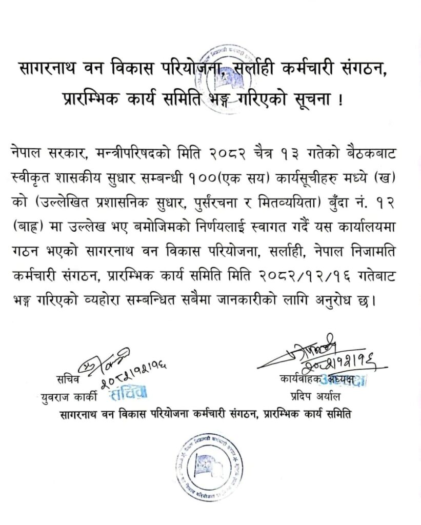 सर्लाही, १८ चैत । सर्लाहीस्थित सागरनाथ वन विकास परियोजनाको कर्मचारी संगठनको प्रारम्भिक कार्य समिति भंग गरिएको छ ।