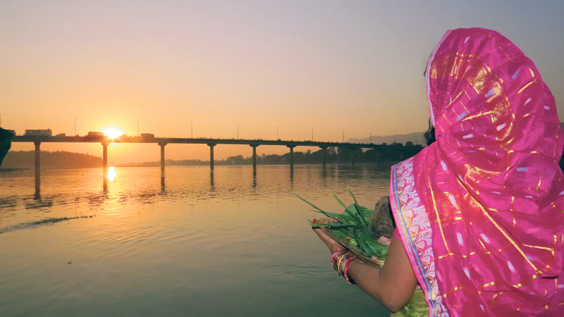 छठको तेश्रो दिन आज (शुक्रवार) साँझ अस्ताउँदो सूर्यलाई अर्घ्य दिइँदै