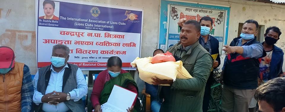चन्द्रपुर नगरपालिकाको प्राङ्गणमा एक कार्यक्रमका बिच राहत सामग्री बितरण गरिएको हो । रौतहटको चन्द्रपुर नगरपालिका भित्रका अपाङ्ग तथा दृष्टिविहिन ५० जनालाई प्रति ब्यक्ति २० किलो चामलका साथमा दाल, सावुन, नुन, तेल लगायतका खाद्यान्न सामग्री बितरण गरिएको लाइन्स क्लव इन्टरनेशनलले जनाएको छ ।
