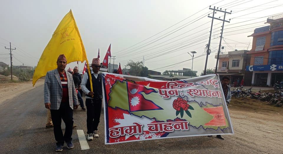 जिल्लाका बिभिन्न स्थानबाट जम्मा भएका युवाहरुले निजगढको बुद्ध चोकबाट सुरु गरेको जुलुस तथा ¥याली लच्का सम्म पुगी पुनः शहिदचोकमा पुगेर कोणसभामा परिणत भएको थियो । ¥यालीमा सहभागीहरुले ‘राजतन्त्र जिन्दावाद, हिन्दुराष्ट्र कायम गरौँ, गणतन्त्र धोका हो, राजा आउ देश बचाउ’ लगाएतका नारा लगाएका थिए ।