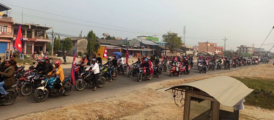 बाराको निजगढमा सोमबार ‘राजा आउ, देश बचाउ’ भन्दै नाराबाजी र मोटरसाईकल ¥याली भएको छ । राजसंस्था र हिन्दुराज्य पुनः स्थापना संघर्ष स्वतन्त्र समितीको संयोजनमा स्वतस्फुर्त रुपमा जम्मा भएका युवाहरुले नाराबाजी सँगै मोटरसाईकल ¥याली गरेका हुन ।