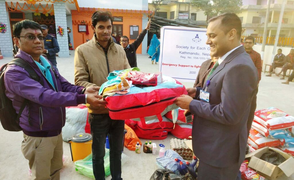 काठमाण्डौँ स्थित Society for each other (आपसको निम्ति समाज) नामक संस्थाले बुधवार जिल्ला बिपद ब्यबस्थापन समिती रौतहटलाई खाद्यान्न तथा स्वास्थ्य सामाग्री प्रदान गरेको छ । जिल्ला प्रसासन कार्यालय रौतहटको प्रांगणमा एक औपचारिक कार्यक्रमका बिच विपद व्यवस्थापन समिति रौतहटका अध्यक्ष एवं प्रमुख जिल्ला अधिकारी इन्द्रदेव यादवलाई करिव ६० हजार बराबरको सामाग्री बितरण गरिएको हो ।