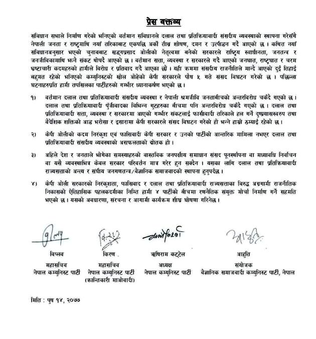 चार पार्टीले मंगलबार जारी गरेको संयुक्त विज्ञप्तिमा भनिएको छ, ‘प्रधानमन्त्री केपी शर्मा ओली सरकारको निरङ्कुशता, फासिवाद र दलाल तथा प्रतिक्रियावादी राज्यसत्ताकाविरुद्ध अग्रगामी राजनीतिक विकासको ऐतिहासिक पहल कदमीका निम्ति हामी ४ पार्टीका बीचमा रणनीतिक संयुक्त मोर्चा निर्माण गर्ने सहमति भएको छ । यसको अवधारणा, संरचना र अग्रगामी कार्यक्रम शीघ्र घोषणा गरिनेछ ।’