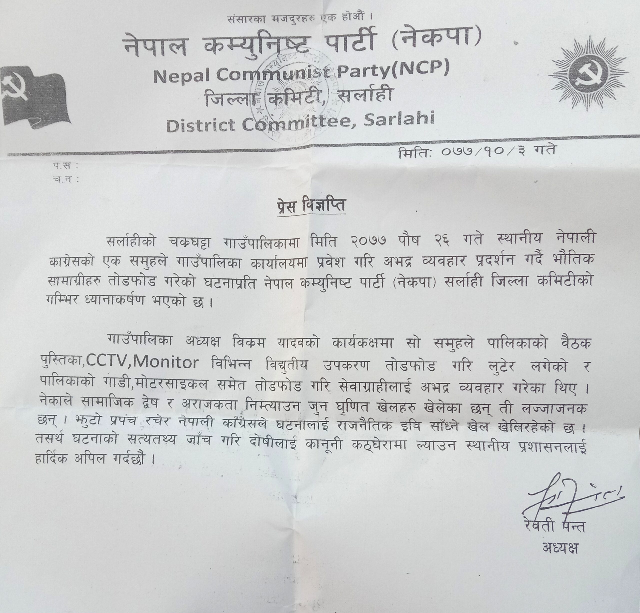 नेकपा जिल्ला कमिटी सर्लाहीका अध्यक्ष रेवती पन्तद्वारा हस्ताक्षरित प्रेस बिज्ञप्ति मार्फत पार्टीले नेपाली कांग्रेसको एक समुहले गाउँपालिका कार्यालयमा प्रवेश गरि अभद्र व्यबहार प्रदर्शन गर्दै भौतिक सामाग्रीहरु तोडफोड गरेको घटनाप्रती नेपाल नेकपा सर्लाही जिल्ला कमिटीको गम्भीर ध्यानाकर्षण भएको उल्लेख गरिएको छ ।