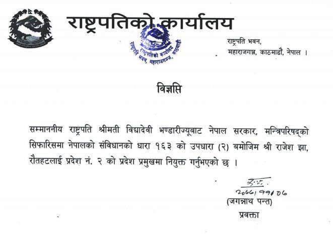 मन्त्रिपरिषद्को सिफारिसमा राष्ट्रपति विद्यादेवी भण्डारीले झालाई प्रदेश प्रमुख नियुक्त गरेकी हुन् ।