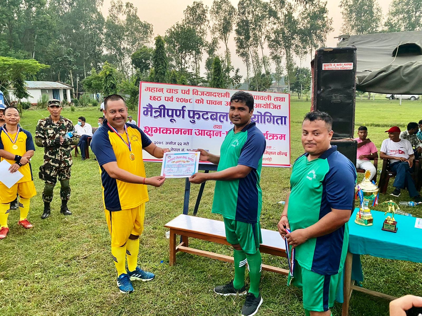 मैत्रीपूर्ण फुटबल प्रतियोगितामा बिजेता तथा उप–बिजेता टिमलाई प्रमाण–पत्र तथा ट्रफी प्रदान पश्चात शुभकामना आदान प्रदान कार्यक्रम गरिएको थियो ।