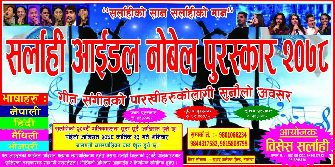 गीत संगीतमा रुचि राख्नेहरुका लागी सर्लाही जिल्लामा पहिलोपटक ‘सर्लाही आइडल नोबेल पुरस्कार २०७८’ नामको सांगीतिक रियालिटी शो हुने भएको छ ।