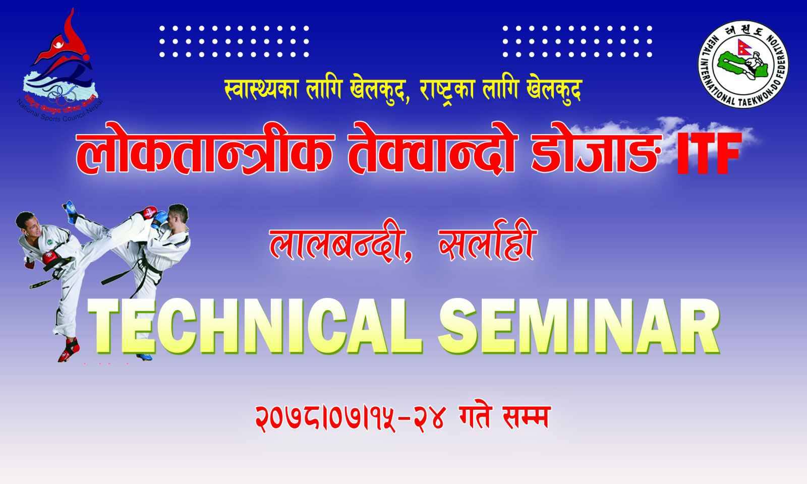सर्लाहीको लालबन्दीमा सोमवारबाट आईटिएफ खेलाडिहरुका लागी टेक्निकल समिनार सुरु भएको छ । लोकतान्त्रीक तेक्वान्दो डोजाङ लालबन्दी सर्लाहीको आयोजनामा सेमिनार सुरु भएको हो ।