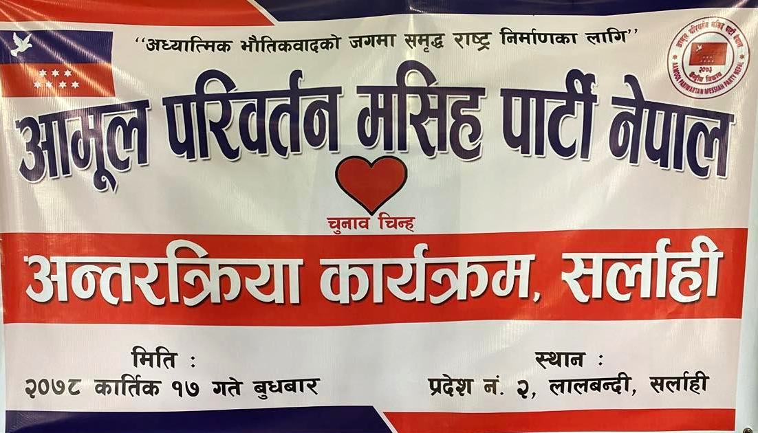 सर्लाही : आमुल परिवर्तन मशिह पार्टी नेपालको जिल्ला कमिटि गठन गरिएको छ । बुधवार लालबन्दी नगरपालीकाको वडा नम्बर ८ मा एक कार्यक्रम गरि पार्टीको जिल्ला कमिटि बिस्तार गरिएको हो ।